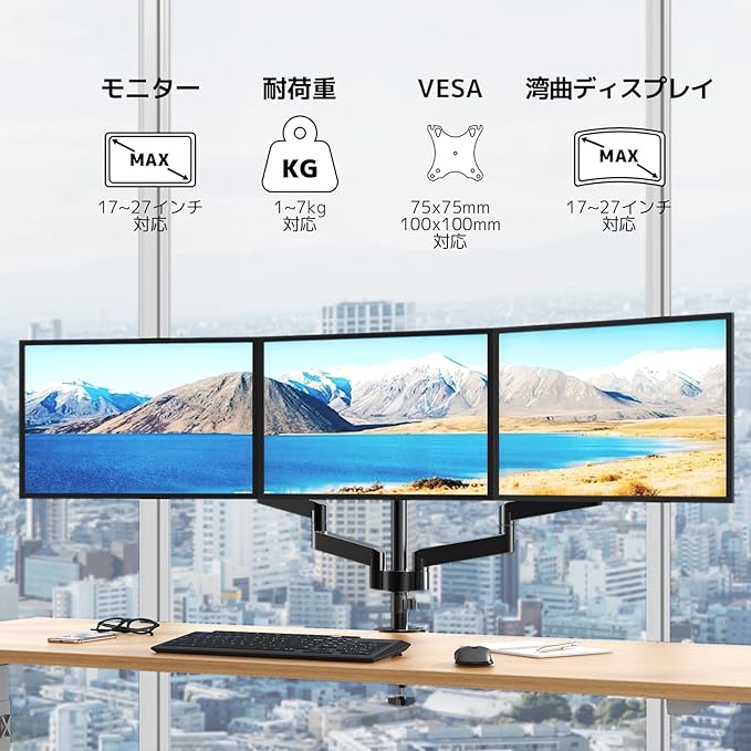 VESA規格対応:VESA規格(75x75mm、100x100mm)に準拠。17〜27インチのモニターに対応し、各アームの耐荷重は最大7kgまでサポート