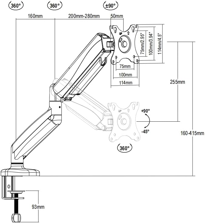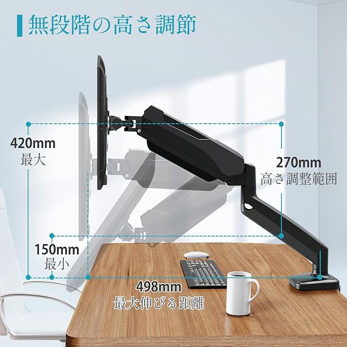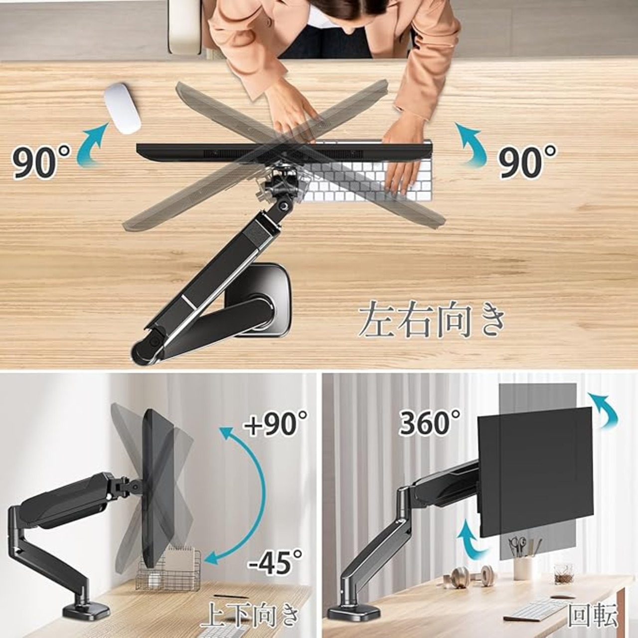 【多角度調整】チルト(上下傾き):上90 /下90 。パン(左右首振り):左90 /右90 。ピボット機能:回転360 。高品質ガススプリング内蔵、より柔軟にモニターの角度を変更できます。回転機能も搭載されたし、画面の横縦の切り替えが手軽に行ないます。