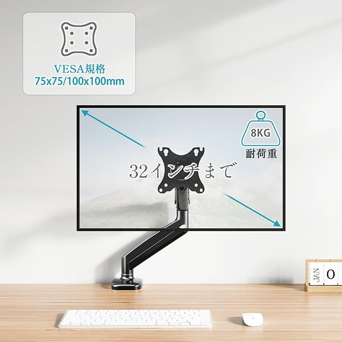 【シングルモニターアーム】軽い力で上下左右や前後に動かせ、液晶ディスプレイの位置を頻繁に変えたい人に向いています。耐荷重は2~8kgで、32インチまでのモニターに対応。準拠のVESA規格は75mm/100mm。(製品について何か質問、または初期不良や欠品などの問題がございましたら、以下の手順でご連絡ください。「アカウントサービス」→「注文履歴」→「販売元」→「質問する?」)