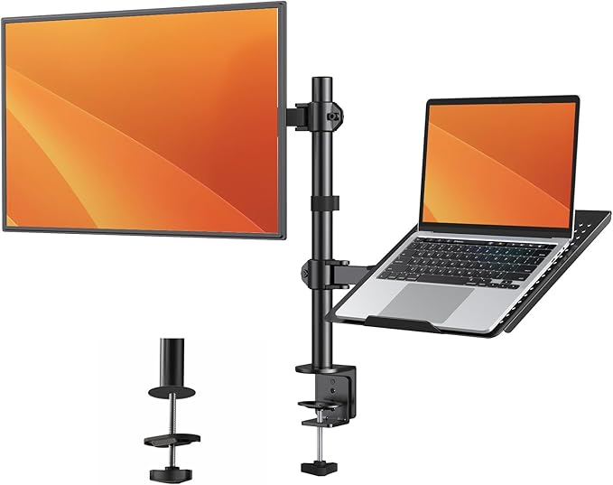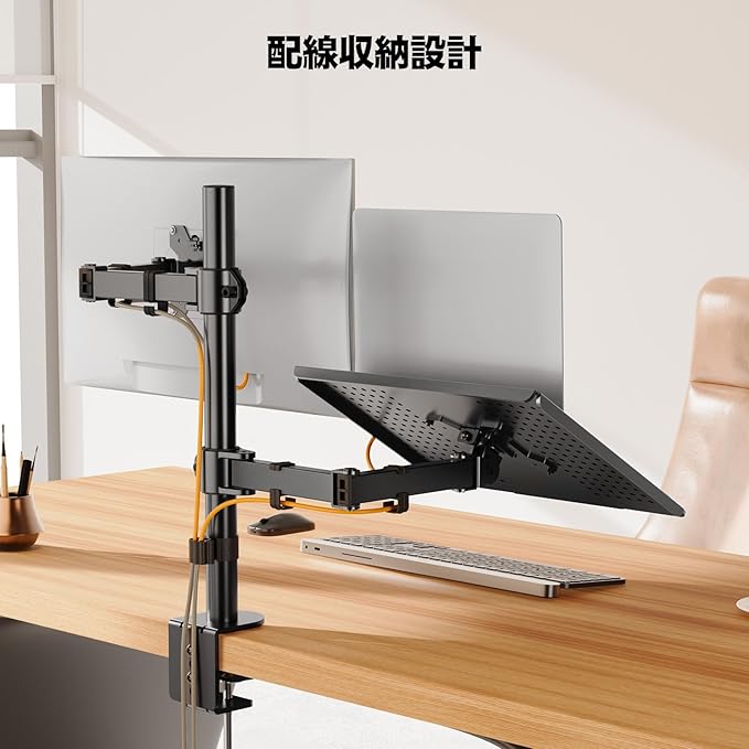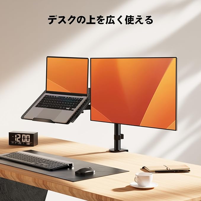 【モニター&ノートパソコンがこの1個で設置可能!】2in1モニターアームでノートパソコンとモニターの高さを揃っており、画面間の視線移動が少なく、また途切れにくくなるため、作業効率の向上が見込めます。また、デスク上に置いていたノートパソコンとモニターをアームに設置することで、デスク上を広く使えるようになります。