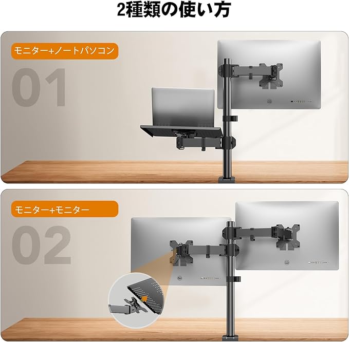 【対応機種を事前確認】①モニターのVESA(背面のネジ穴の間隔)が75x75mmまたは100x100mmであることを確認してください。②モニターのサイズが13~27インチ以内、ノートパソコンのサイズが15.6インチ、重量が10kg以内かご確認してください。◆ノートパソコントレイを外して、デュアルPCモニターアームとしても使用可能です。