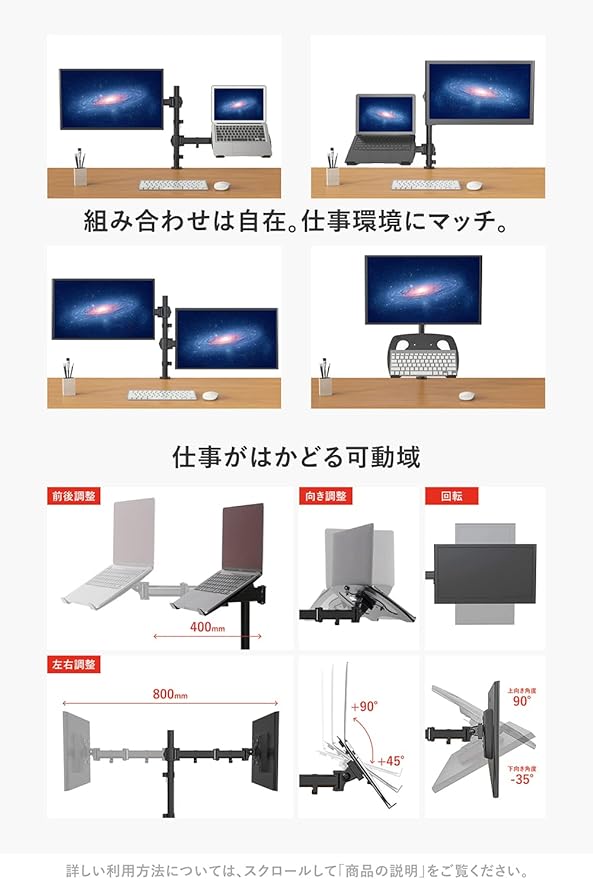 ✅【 組み合わせは自在 仕事環境にマッチ 】左右、上下どちらにモニター、ノートPCを置いてもOK。モニター2台の組み合わせでもOK。だから、仕事場、ご自宅にマッチします。✅【 スペック詳細 】2画面(デュアル)式・VESA75 75, 100 100対応・アルミ合金製・対応モニター[15~32インチ]・対応ノートPC[12~17インチ]・耐荷重[0~8kg/モニター、ノートPC1台当たり] ✅【 梱包サイズ 】43.0 25.5 8.5cm・重量4.9kg✅【 セット内容 】モニターアーム一式・日本語説明書・組立動画・組立工具一式 ✅【 ご準備が必要な工具 】なし .