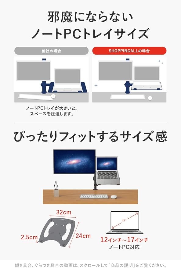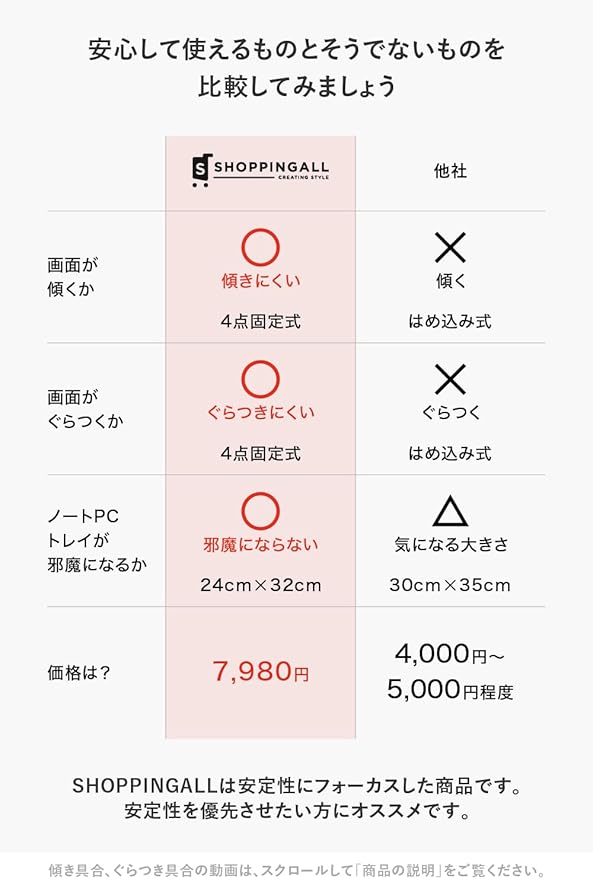 ✅【 他社製品の問題点を改善 】安心して使える。その理由は、他社製品と違い、画面が傾きにくい、ぐらつきにくい から。✅【 傾きにくい、ぐらつきにくい 理由 】ノートPCトレイ、モニター接続部は4点でネジ留めする4点固定式で、ノートPC、モニターをしっかり支えます。だから、傾きにくい、ぐらつきにくい。 正しい設置方法をした場合に限る。正しい設置方法は商品ページ下部をご覧ください。動画でご確認いただけます。 安価な類似品は、ノートPC、モニター接続部に隙間があるはめ込み式。だから、傾く、ぐらつく。 .