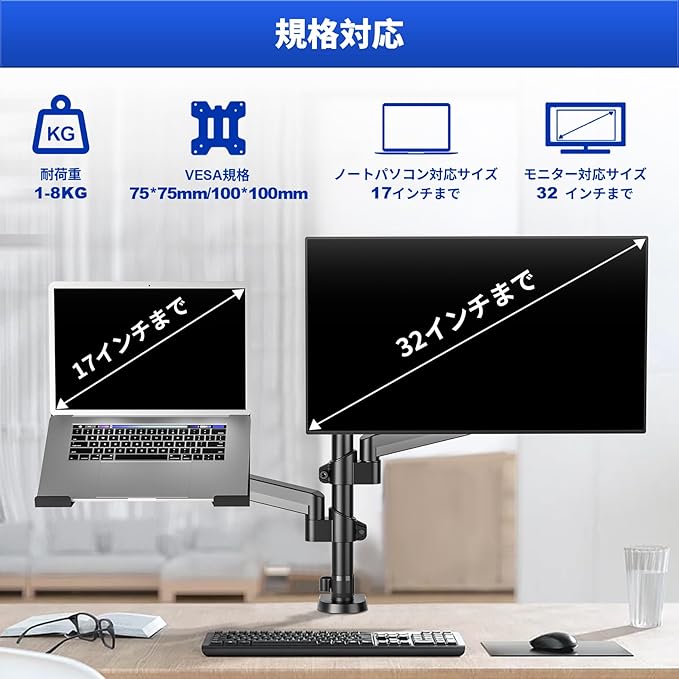 ➤対応ノートパソコン&モニター:17インチまでのノートパソコンと32インチモニターに対応できるデュアルモニターアームです。VESA規格:75mm x 75mm、100mm x 100mm、耐荷重は1-8kgです。