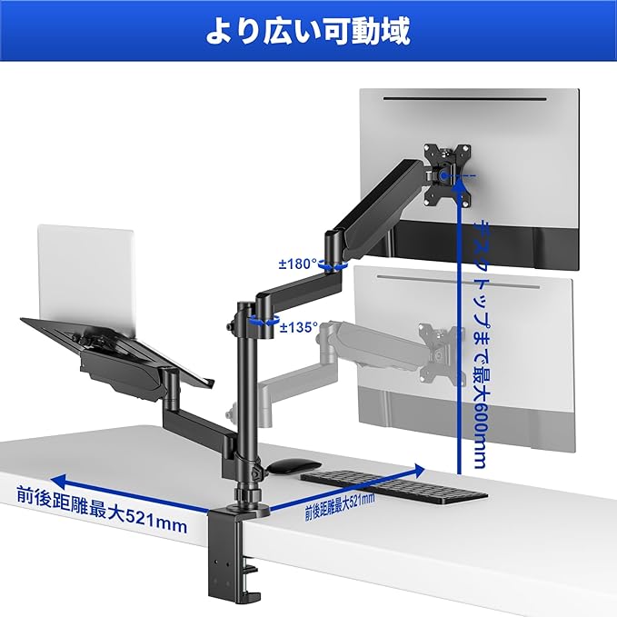 ➤角度 高さ 前後距離調節:革新的な多軸設計でノートPCと液晶ディスプレイを上45 、下45 、左右90 、回転360 に調節可能です。また、ガススプリングで最大600mmの高さと521mmの前後距離を調節でき、活動範囲が広くて便利です。動画鑑賞やオフィスワーク、テレワークなど様々な用途に合わせて、背や目の疲れを軽減でき、作業効率が上がります。