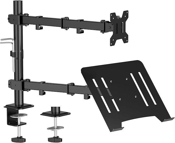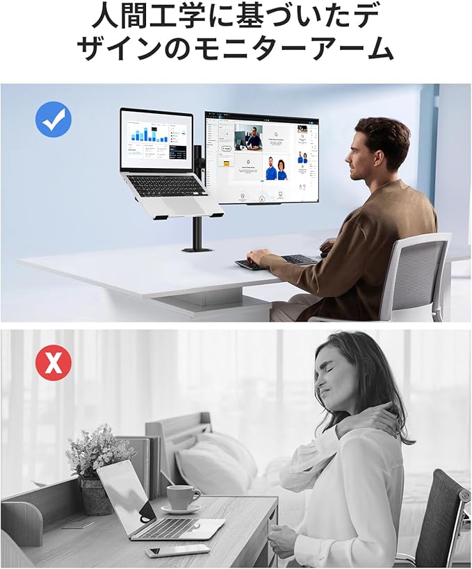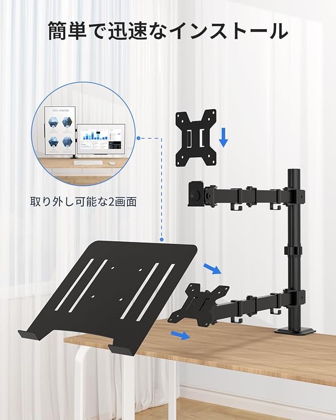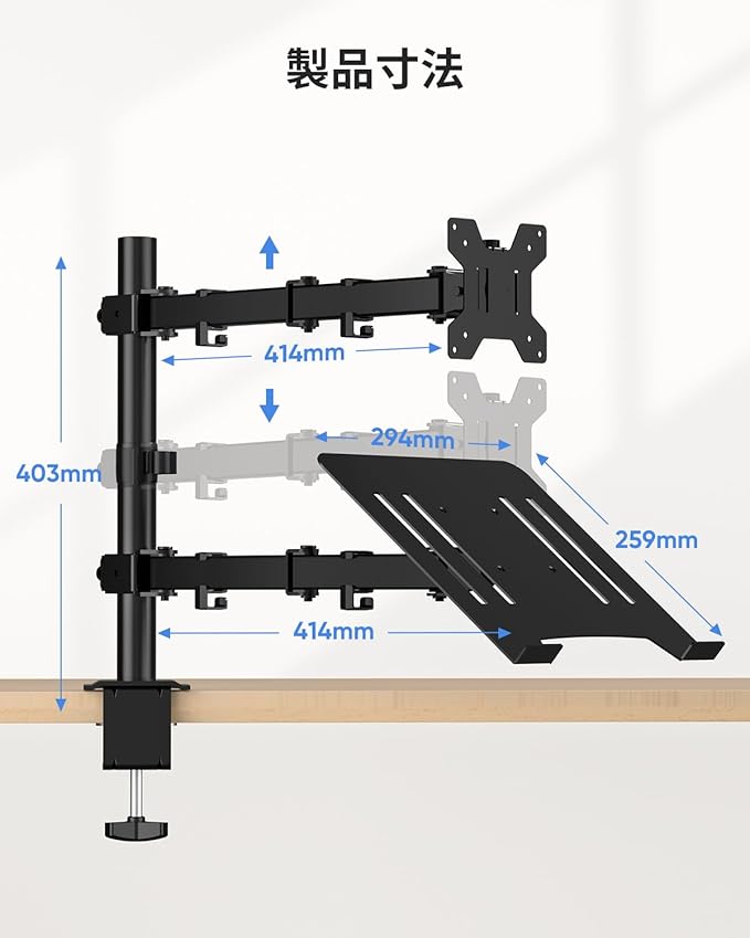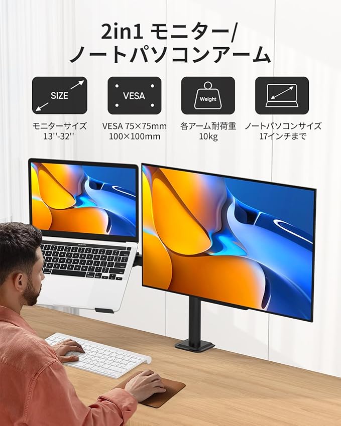 【2in1モニターアーム】PCモニターアームとノートパソコンスタンドが融合されていて、ディスプレイやノートパソコンがより快適に使えます。トレイを外し、2枚PCモニターをつけることも可能です。高さ調節可能で、pcが13-32インチ、10kgまで、ノートパソコンが17インチまで対応。VESA規格100x100mm、75x75mm。