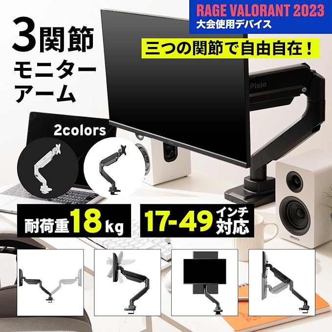 Pixio PS2S White モニターアーム 白 シングル 17-49インチ対応 耐荷重2-18kg クランプ グロメット ホワイト