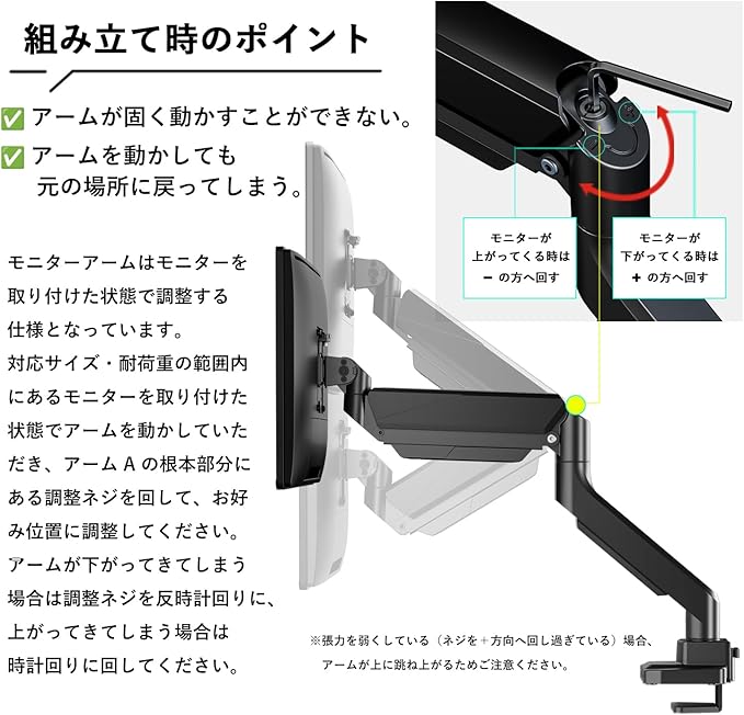 [組み立てのポイント]モニターを取り付けた状態で、アームが水平になるように(アームが下がってくる場合は反時計回り、上がってくる場合は時計回りに)調整ネジを回してください。