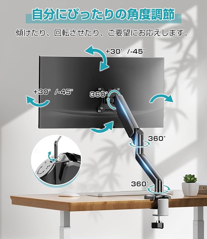 【角度と高さを自由に変えれる】チルト(上下傾き):上90 /下90 。パン(左右首振り):左90 /右90 。モニターを回転することができ、通常の横位置だけでなく縦位置での使用も可能。表計算ソフトやテキストの閲覧など作業効率が上がります。縦位置での使用も可能です。本品は接合部が360度回転することができ、片側0-516mm前後のストレッチが可能です。133 ~ 428mmの高低調整区間もあり、お好みの高さで仕事ができます。