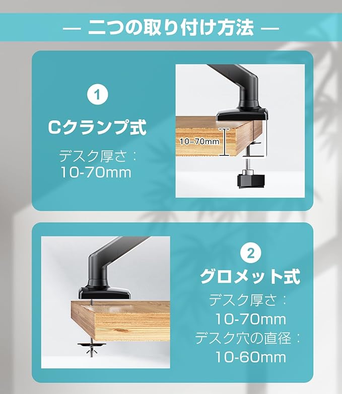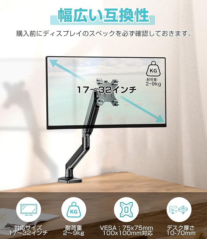 【ご購入前確認してください】:①テスクの使用可能厚さ:10-70mm;②V75x75mm 100x100mmのVESA規格に対応;③モニターのサイズは17~32インチまで;④モニターの显示器耐荷重:2~9kg対応
