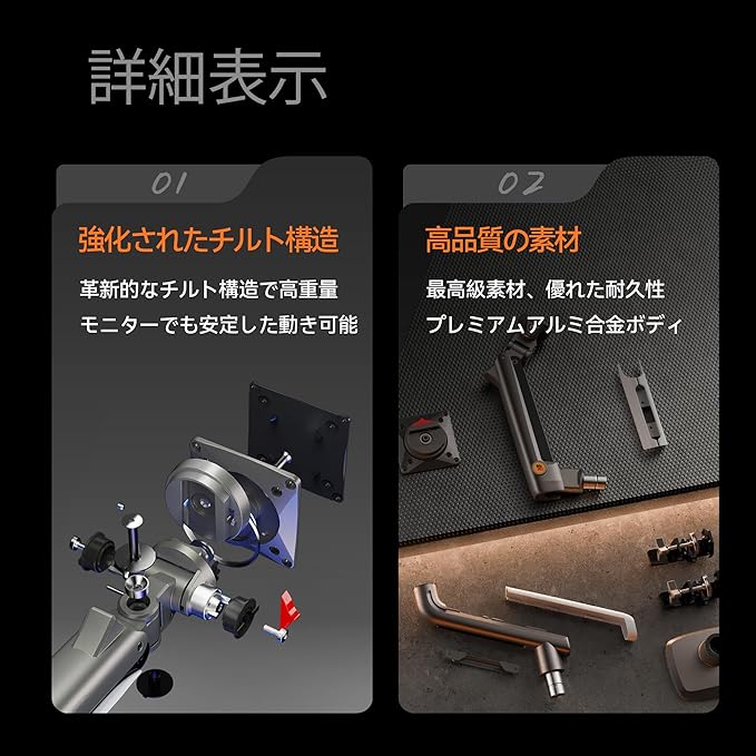 【多角度調節】フルアジャスタブルモニターアーム(5軸):上下 50度の傾斜、360度の回転、左右 90度の画面回転、アーム関節360度回転。自分に合った高さや角度にモニターの位置を変えられます。前後左右だけでなく、上下にも動かせ見やすい位置まで調節できるため、細かい文字や数字の確認や動画視聴、ゲーミング等に適しています。