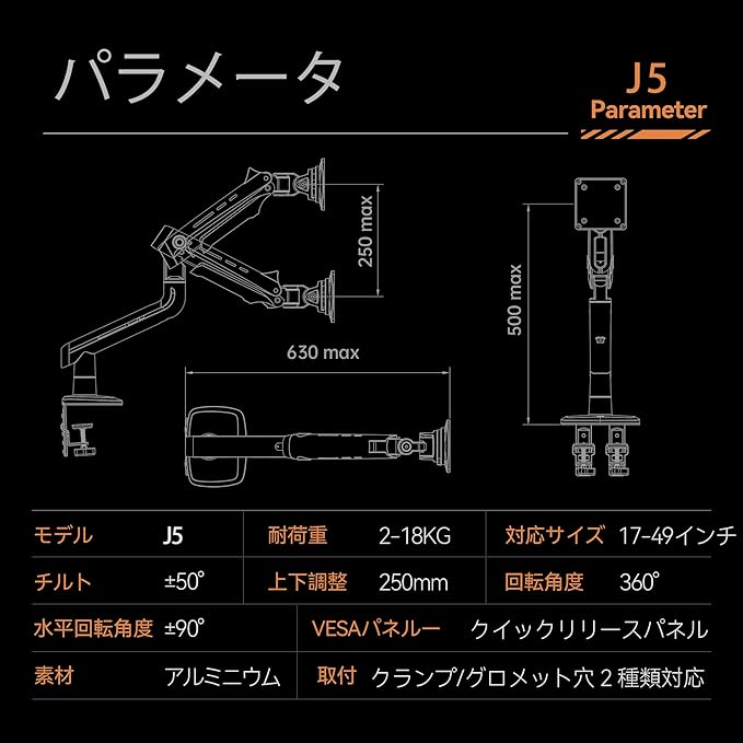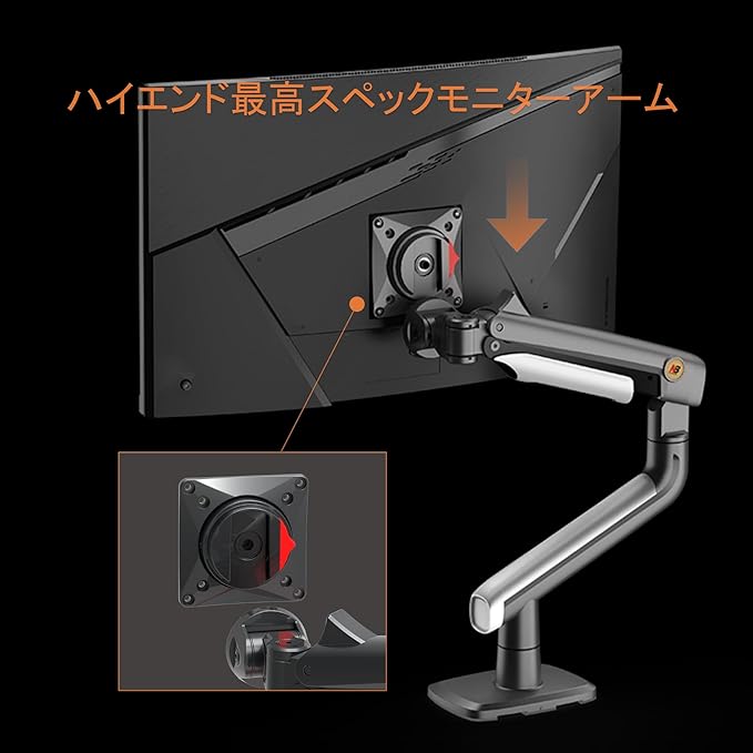 NB ERGONOMIC 大型モニターアーム 大画面 高耐荷重2-18㎏ 24-49インチ対応 ウルトラワイド湾曲用 ゲーミングモニターアーム 24 27 32 34 42 49インチ対応 ディスプレイアーム 曲面モニター 機械スプリング VESA75mm/100mm モデル:J5
