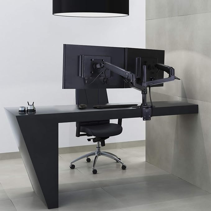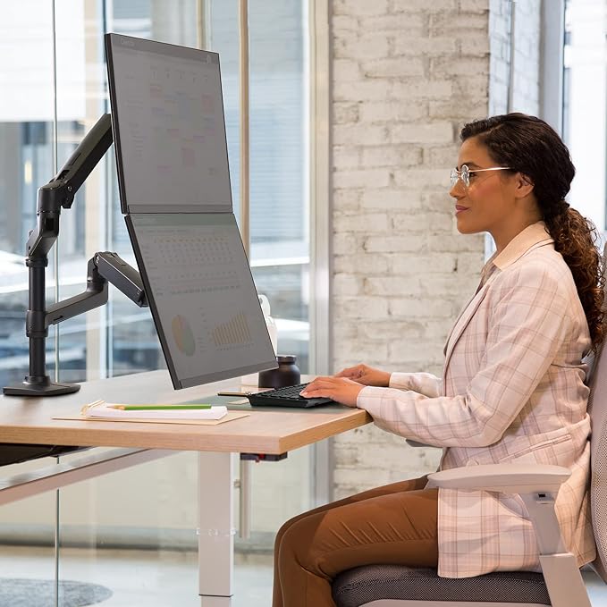 横並び、縦並び両方のデュアルモニター環境に対応するモニターアームです。使用しないときはコンパクトに折りたため、作業スペースを広く使えます。