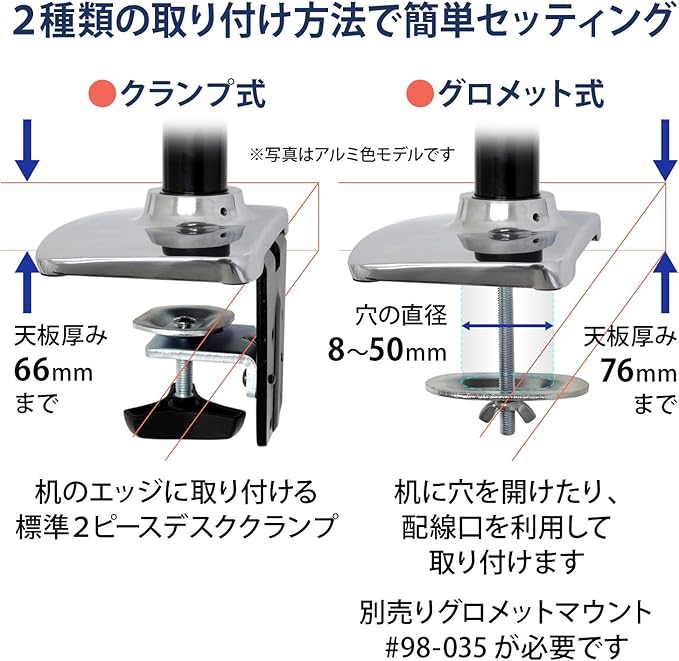 デスククランプは66mmまでの厚さ、グロメットマウントは直径8~50mmの穴、76mmまでの厚さに取り付け可能。