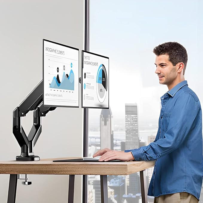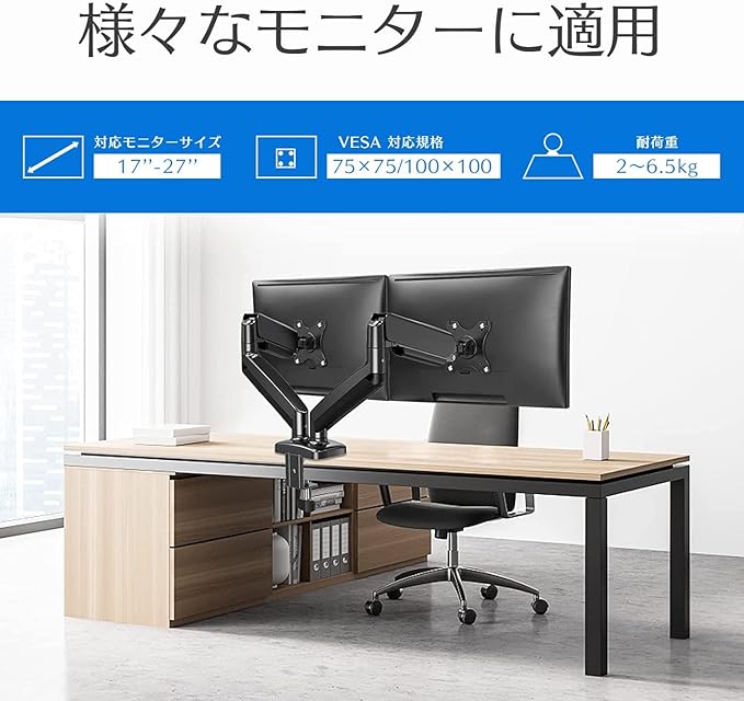 【わたしのモニターに対応❓】モニターアーム デュアル、最大6.5kgの27インチまでLCDモニター利用できます。ガススプリングアームにより、モニターの位置を視角に合わせて簡単に調整できます。 良い姿勢を維持することにより、肩、首、背中等の痛みを和らげます。