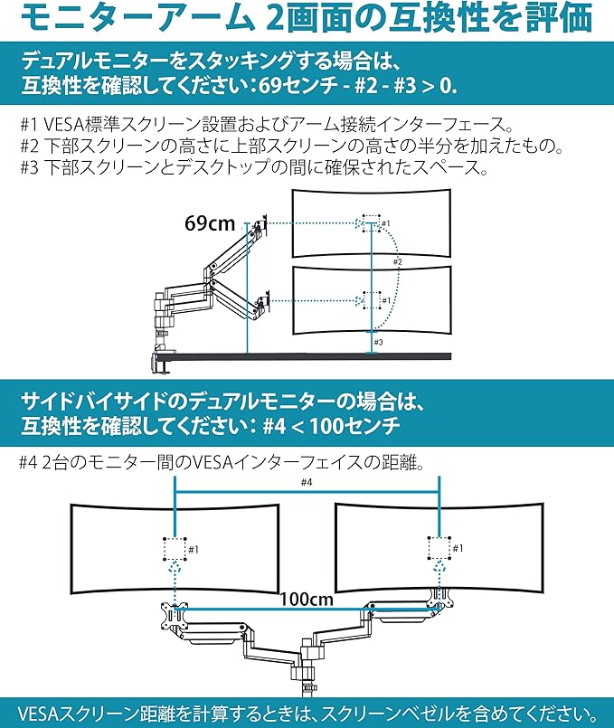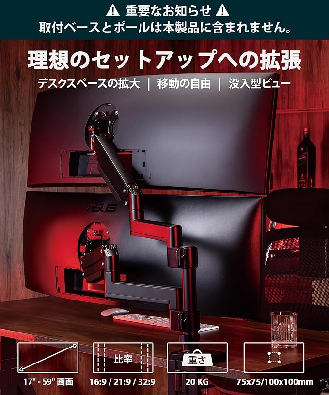 ウルトラワイドモニターに適合 - 最大20キロ(44ポンド)の重さのモニター1台を保持。最大57インチのウルトラワイドモニターと、49から24インチの平面、1000Rまでの曲面のスクリーンに対応。クイックリリースVESAブラケットは75x75mmと100x100mmの取り付けが可能です。