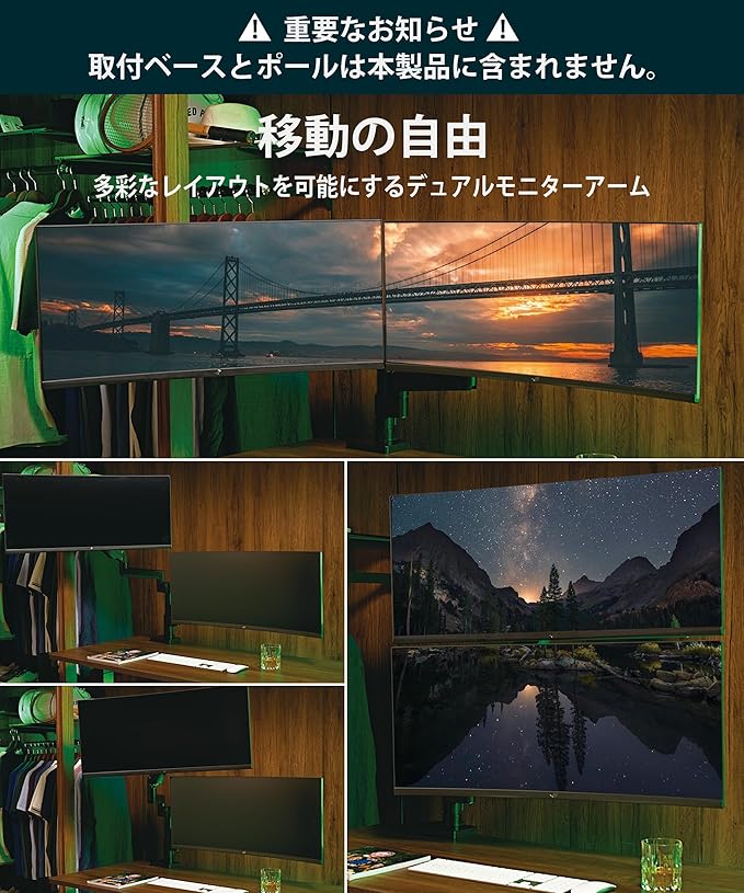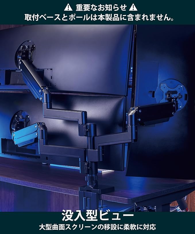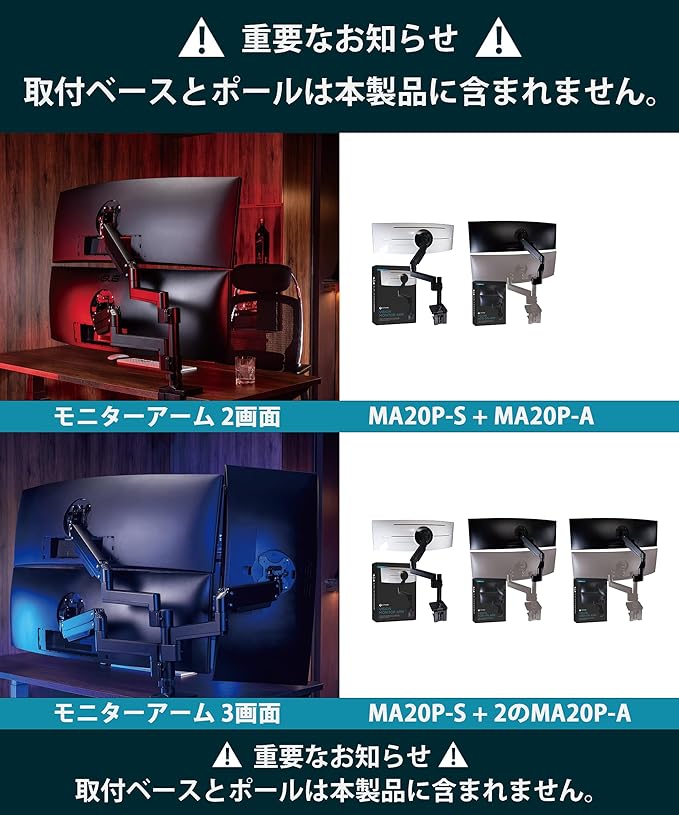 モジュラーエクステンションアーム - モジュラー拡張アーム - 非常に高いポールを備えたベースは、40キロ(88ポンド)のマウント能力を持ち、デュアルモニターマウントまたはトリプルモニターマウントにアップグレードできます。デュアルスタックモニターマウントは、49インチのウルトラワイドモニターを2台まで取り付け可能です。トリプルモニタースタンドは、2台のスタックモニターとサイドモニター1台に対応します。
