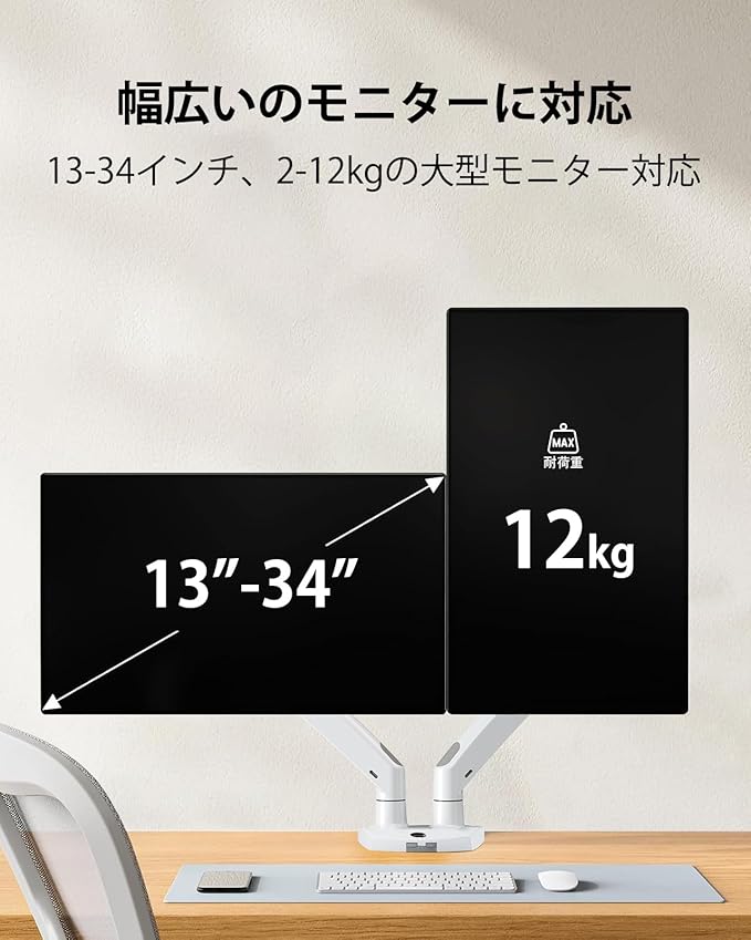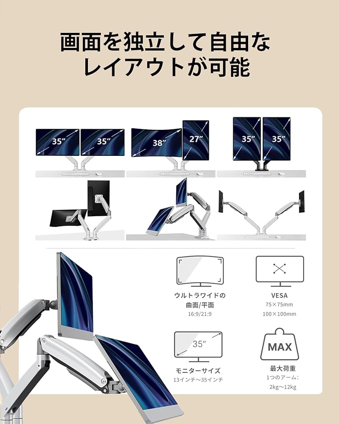 【ご購入前のチェックポイント】①モニターのサイズは13~35インチまで ②モニターとモニターアクセサリーの重量は2~12㎏以内 ③75mm*75mmと100mm*100mmのVESA規格に対応 ④取付可能天板:厚さ10mm~90mm。