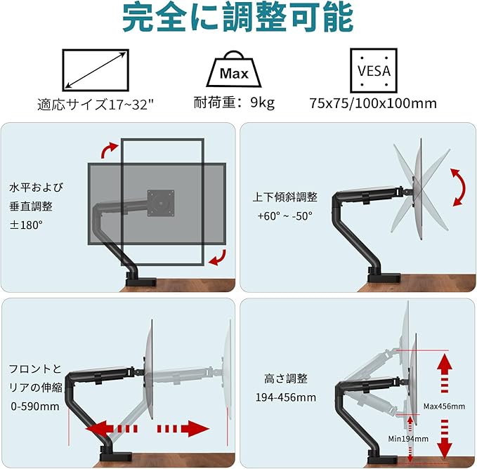 ガススプリングディスプレイアーム: 17-32インチ対応;対応規格:VESAマウントインターフェース規格(75*75mm/100*100mm)、耐荷重は9KGです;