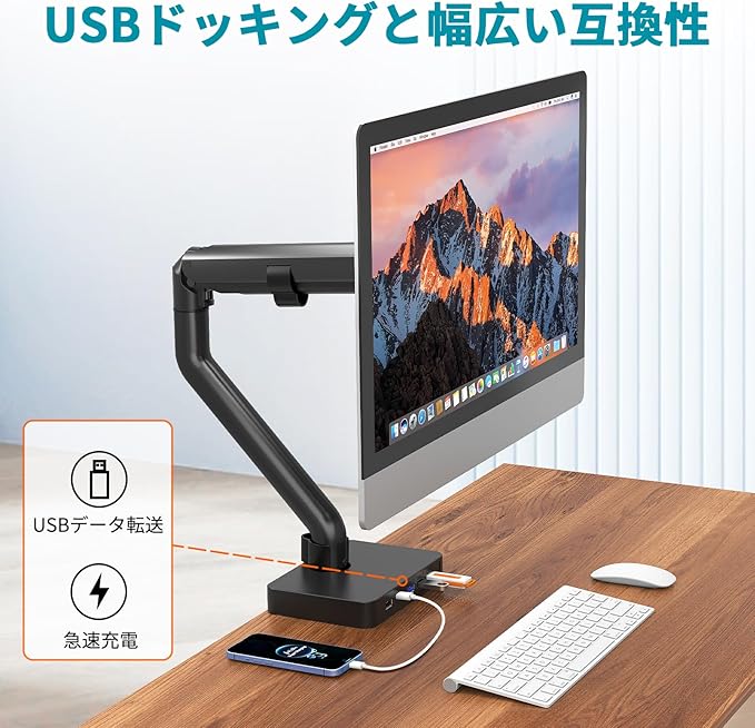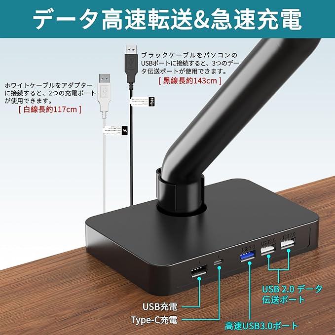 2つの充電ポート:Type-C/USB充電ポート各1基付属(付属ケーブル接続で急速充電対応)、急速充電をお楽しみいただけます!コストパフォーマンス重視で初めてのモニターアームの方にオススメです;