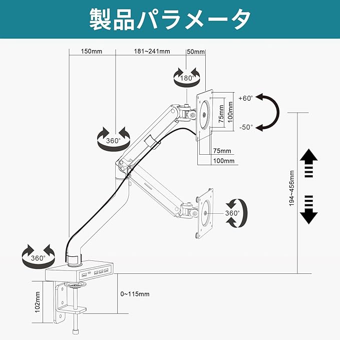 多軸調整システム:上60 /下45 チルト、左右180 スワivel、360 回転(縦位置変換可能); 高さ調節範囲:194-456mm;ストレッチ可動域:0~590mm;