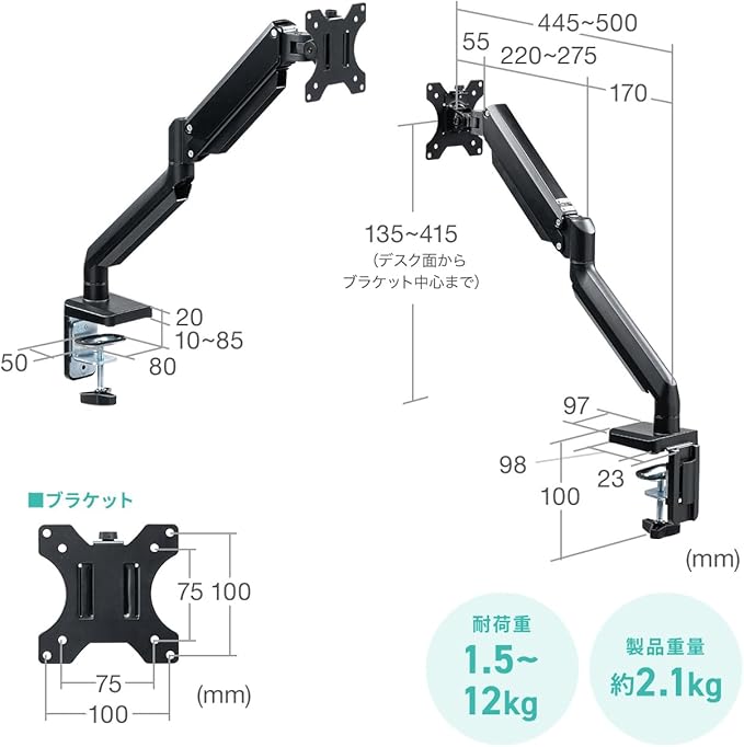 1.5~ 12キロ までの液晶モニターの取り付けに対応しています。 パソコンアーム は クランプ 式での 組立簡単 取り付けと、 ネジ穴固定 の グロメット 式の取り付けに対応しています。