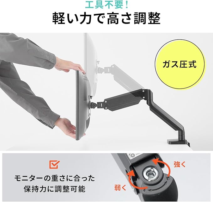 液晶 モニター を目線の高さに合わせて 上下調節 が行えます。 モニタアーム はガス 圧式で、 ガススプリング でスムーズな 高さ調整 が可能です。