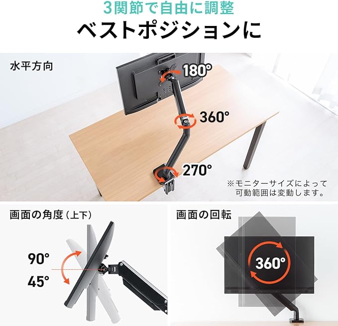 サンワダイレクト モニターアーム 水平垂直3関節アーム 32インチ対応 耐荷重12㎏ ガス圧式 クランプ/グロメット対応 高さ/角度調整 回転 ディスプレイ アーム VESA PC ブラック 100-LAC003