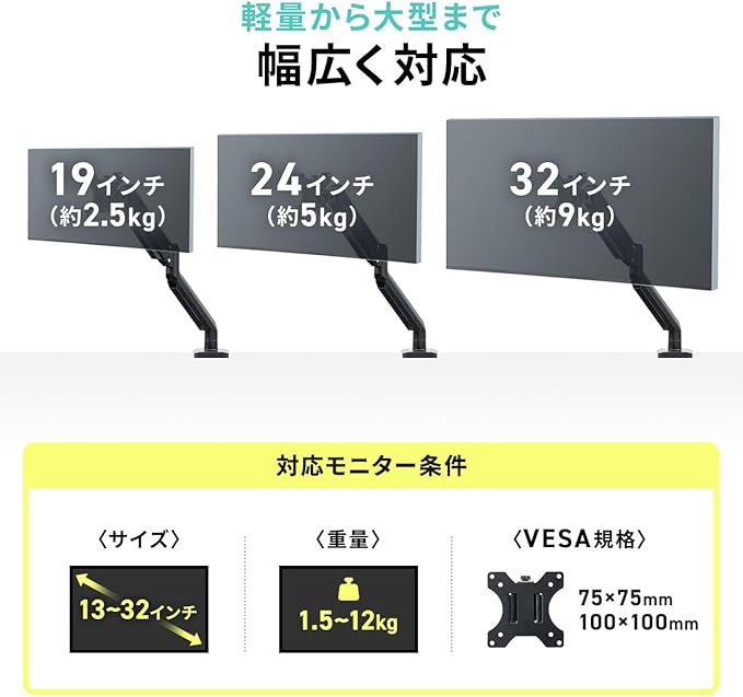 VESA 規格 ( 75 75mm 、100 100mm)に準拠した 32インチ までの PCモニター 、 液晶ディスプレイ の取り付けが可能です。 32インチまで対応 しているので、 27インチ などの ゲーミングモニター にも おすすめ の ゲーミングモニターアーム です。