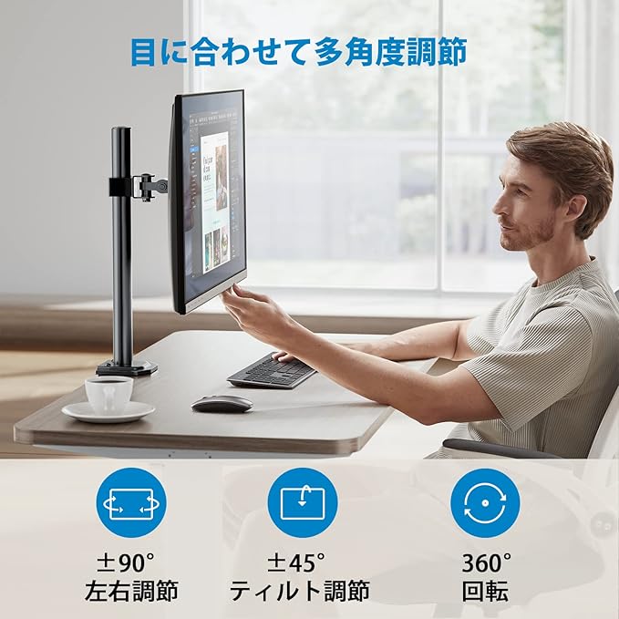 【ディスプレイ角度を自由に変えれる】(1)アーム:移動で高さ調節 (2)VESAプレート部:上向き45 、下向き45 、回転360 、左右各90 。角度や距離などが自分に合って、前後左右に加えて上下も好みの位置に軽々と動かすことができます。ビジネスでの利用はもちろん、トレーダーやゲーマーの方にもおすすめです。