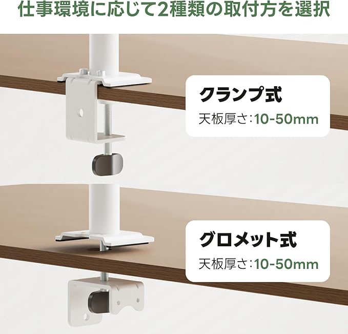☻【設置簡単】仕事環境に応じて2種類の取付方を選択できます。クランプ固定とグロメット固定で簡単です。天板厚:10~50㎜。