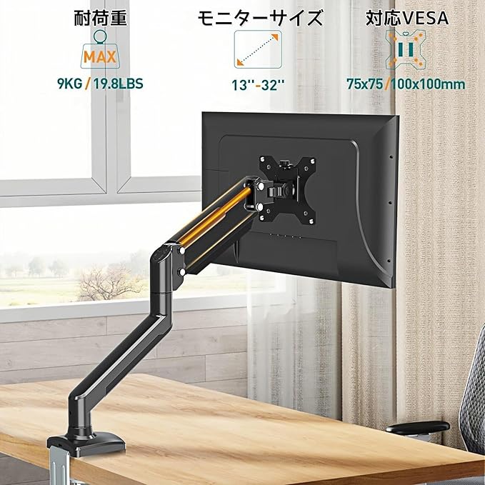 【商品仕様】13インチから32インチまでの液晶ディスプレイに対応できるモニターアームです。対応規格:VESAマウントインターフェース規格(FPMPMI)75mm*75mmと100mm*100mm、耐荷重は2-9KGです。取付可能天板:クランプ式は厚さ10mm~70mm、グロメット式は10mm~60mmに対応。