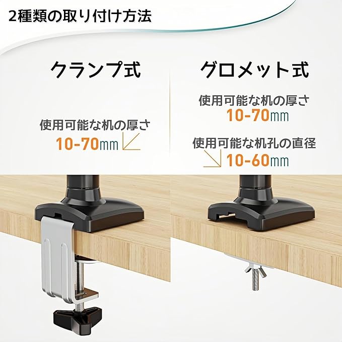 【2種類の設置方法に対応】PCモニターアームはデスクの側面に固定するCクランプ式と穴を利用して固定するグロメット式の2種類の設置方法に対応しており、オフィスやリモートでのテレワークなど様々なデスクに設置が可能です。机にしっかり固定するので、液晶ディスプレイの転倒を防ぎ、耐震にも効果があります。