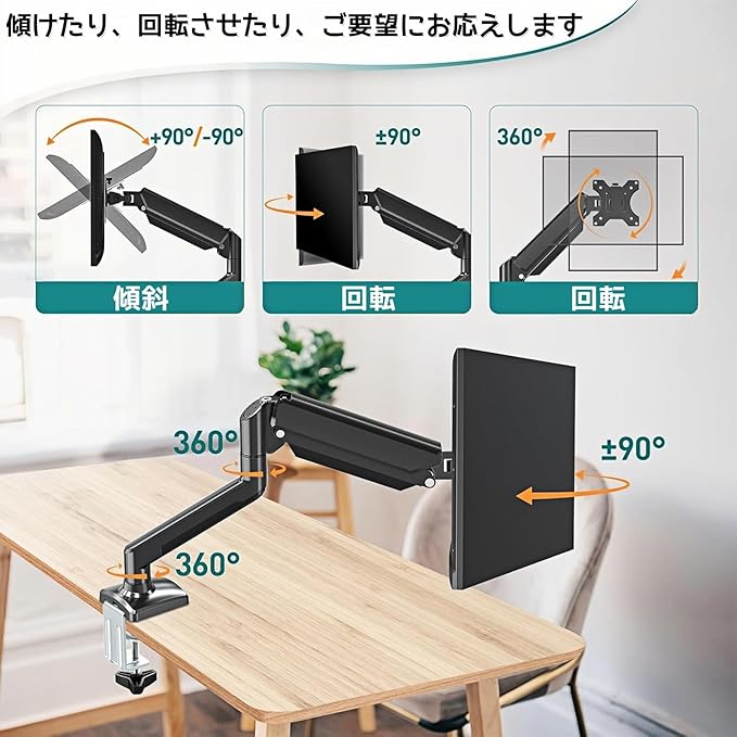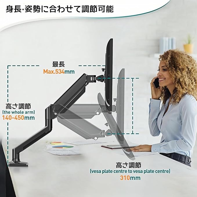 【ディスプレイ角度を自由に変えれる】①アーム:ガス圧で高さ調節。②アーム関節部360 。③VESAプレート部:回転360 、左右各90 。角度や距離などが自分に合って、前後左右に加えて上下も好みの位置に軽々と動かすことができます。ビジネスでの利用はもちろん、トレーダーやゲーマーの方にもおすすめです。人間工学に基づいた設計により、頭を下げて作業するという「習慣の壁」を破り、高さは身長とテーブルに合わせて簡単かつ迅速に調整できます!