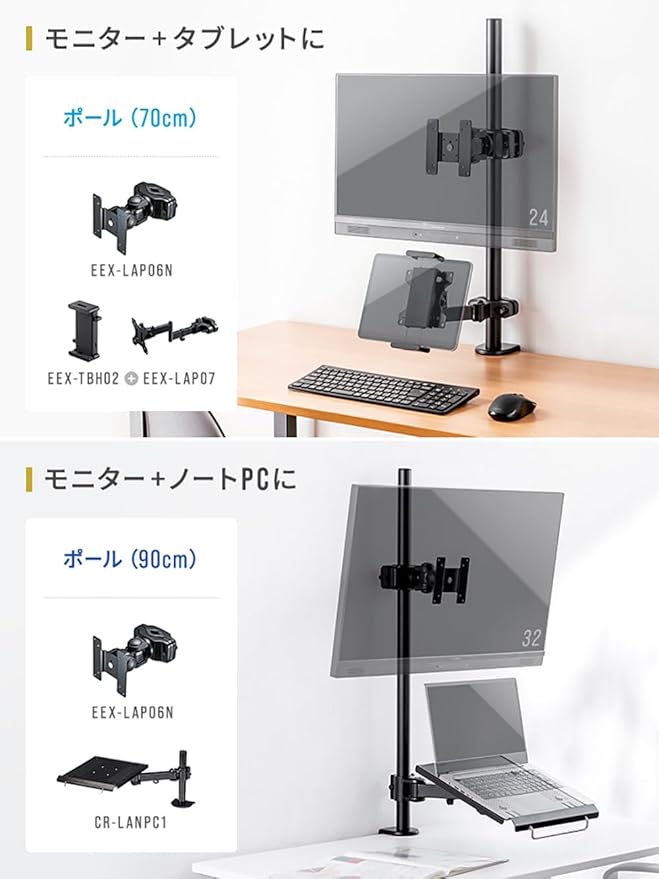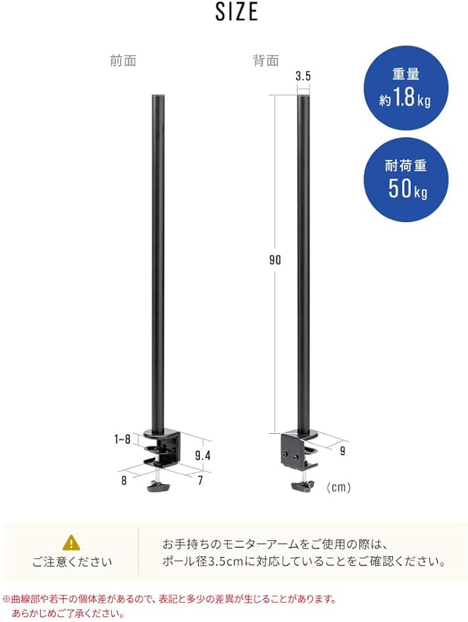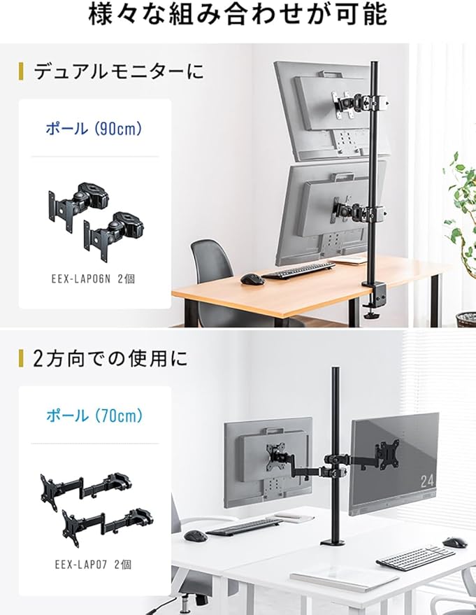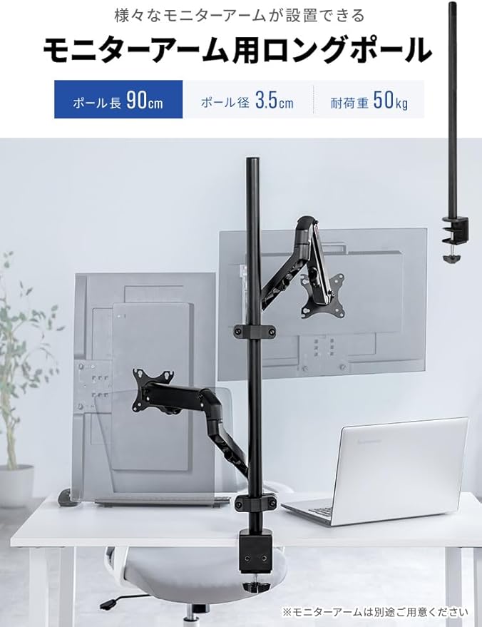 【長さ90cmで広がる可能性】モニター設置の自由度が大幅にアップ!90cmのロングポールで、デュアルやトリプルモニター環境を簡単に構築可能です。