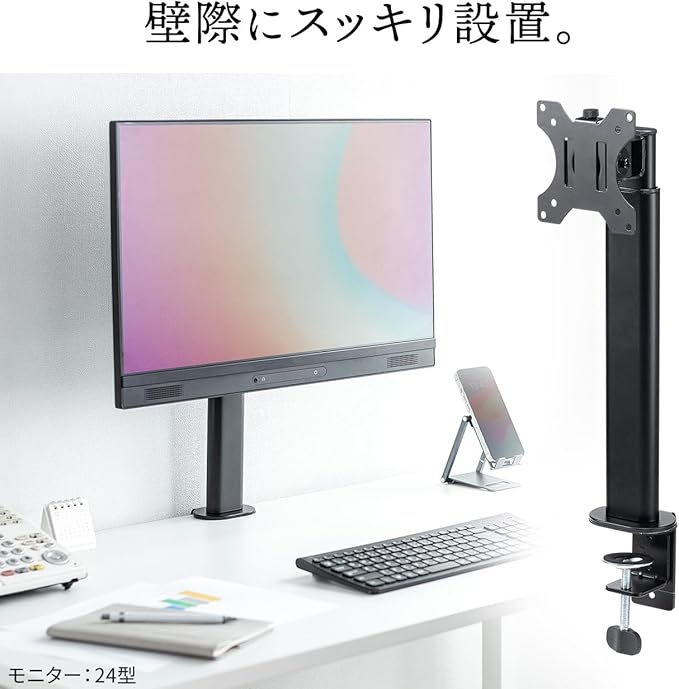クランプ で挟み込んで 固定 できる シングル PCモニターアームです。