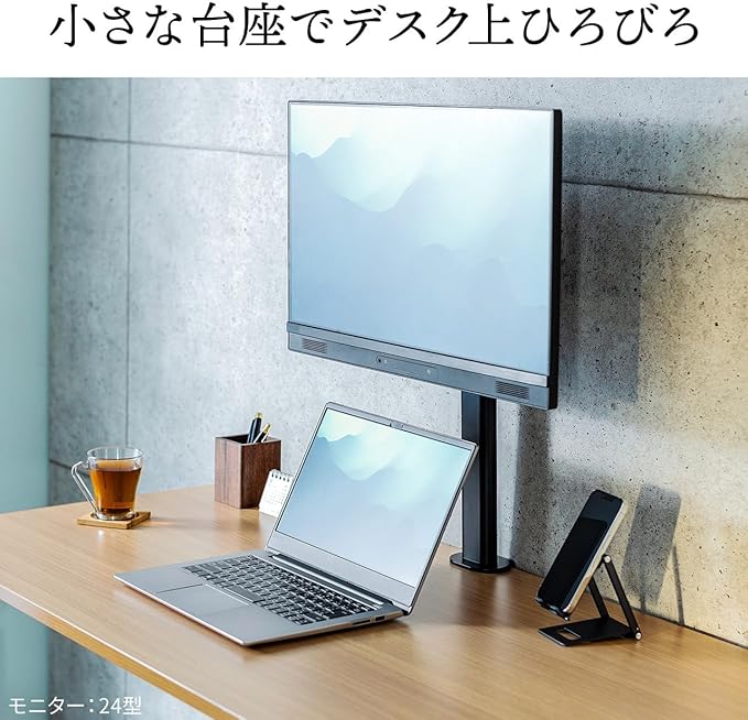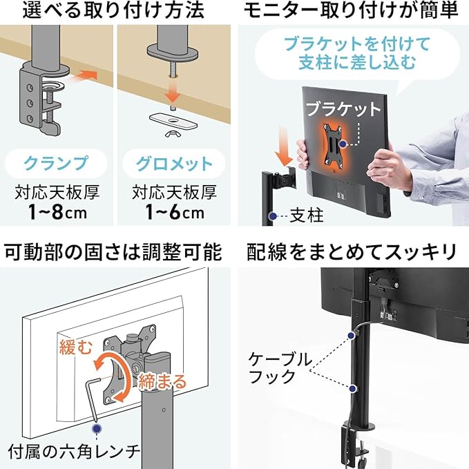 クランプ式 は 薄型 の スリムクランプ での取り付けなので、 組立簡単 に設置できます。 ネジ固定式 の グロメット 取付けにも対応しています。 ディスプレイアーム を使うことで、 パソコン の 台座 、 スタンド を必要としない分広々と デスク 上 、 卓上 を使用できます。