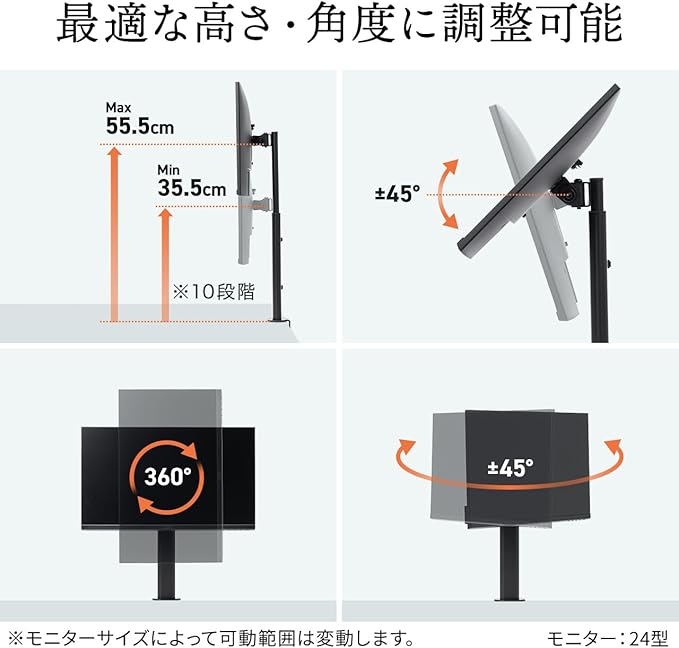 高さ調整 は、35.5~55.5cmまで10段階で対応した パソコンアーム です。