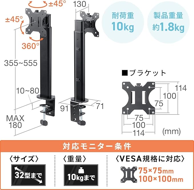 サンワダイレクト モニターアーム 32インチ対応 耐荷重10㎏ クランプ/グロメット対応 高さ/角度調整 回転 省スペース ディスプレイ アーム VESA PC 100-LAC002