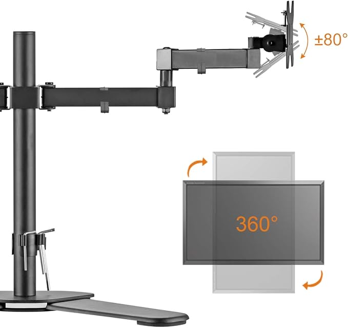 【ディスプレイ角度を自由に変えれる】①アーム:ポールの接続部分移動で高さ調節(406mm) ②VESAプレート部:上向き80 、下向き80 、回転360 、左右各90 。角度や距離などが自分に合って、前後左右に加えて上下も好みの位置に軽々と動かすことができます。ビジネスでの利用はもちろん、トレーダーやゲーマーの方にもおすすめです。 ご注意:付属の六角レンチでボルトを締めて傾斜角度を固定します。一方のモニターが低い場合は、ナットを取り外し、付属の六角レンチでボルトを反時計回りに回してモニターを上げます。調整後、ナットを取り付けます。
