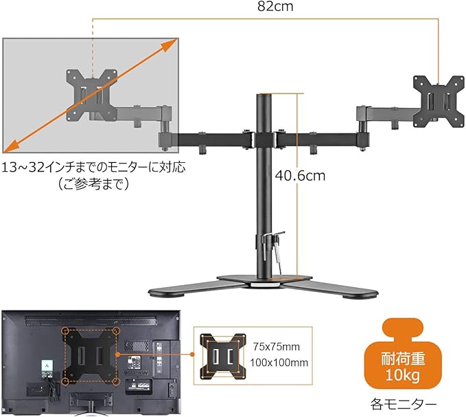 【対応モニター】液晶モニターを2画面設置できるデュアルディスプレイアームです。耐荷重は10KG(1台)で、VESA規格は75 75mm/100 100mmで、13~32インチPCモニターに対応します。