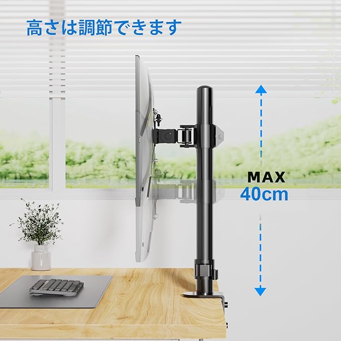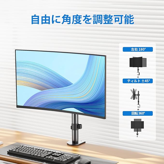 【快適な視野と広範囲な調整】このデスク モニターアームは、モニターを 45 傾斜、 90 左右、360 回転、高さ調整が可能です。より快適な環境で作業、ゲーム、動画視聴をお楽しみいただけます。