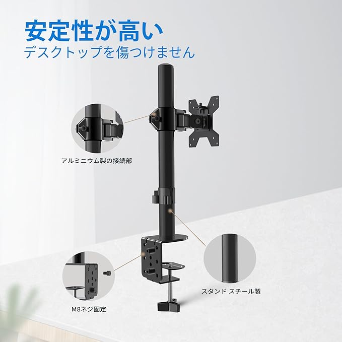 【高い安定性】当社のモニターアームは主に鋼鉄で製造されており、主な接続部品はアルミニウム合金を使用しています。ベースと接続部を固定するために M8 ネジを採用しています。M8 ネジは直径が大きいため断面積が広く、そのため高い強度と耐荷重性能を備えています。