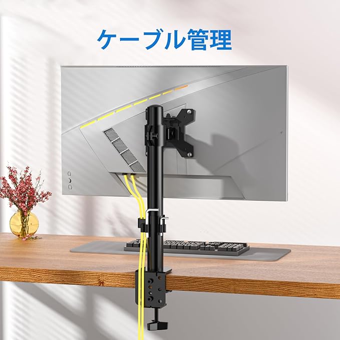 【省スペース設計】コンピュータモニターアームは小型で、場所を取りません。ケーブルマネジメント機能とレンチ収納機能も備えており、センターポールの取り外し可能なケーブルクランプで電源ケーブルやAVケーブルをすっきりと整理できます。省スペースでデスクをすっきりと保ちます。