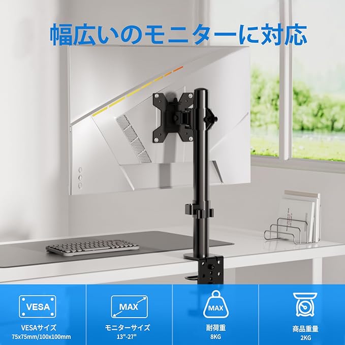 【広い互換性】シングルモニターアームとの互換性を確保するために、お使いのモニターは以下の3つの条件をすべて満たしている必要があります:①モニターサイズ:13~27インチ。②モニター重量:2~8kg。③モニター背面にVESA取り付け穴(75 75mmまたは100 100mm間隔)があること。ご購入前に、お使いのモニターが全ての条件を満たしているかどうか必ずご確認ください。不明な点がございましたら、お気軽にお問い合わせください。