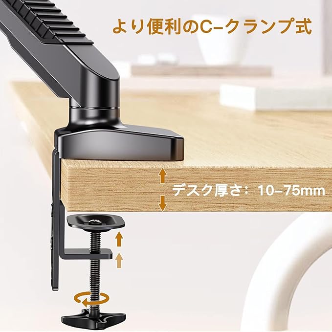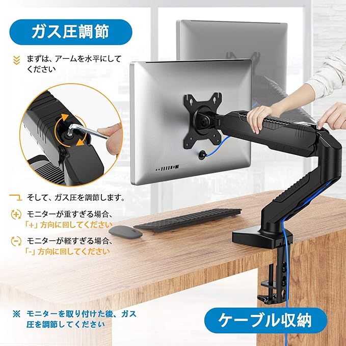 【快適にPC作業を行う】自分に合った高さや角度に変えられます。前後左右だけでなく、上下にも動かせる見やすい位置まで調節可能であるため、細かい文字や数字の確認や動画視聴などに適しています。また、モニターの位置を下げて角度を上向きにすることで、タッチパネルでの操作も便利です。※ガス圧調節方法:①モニターをアームに取り付けます②アームを水平にします③レンチでガス圧を調節します。