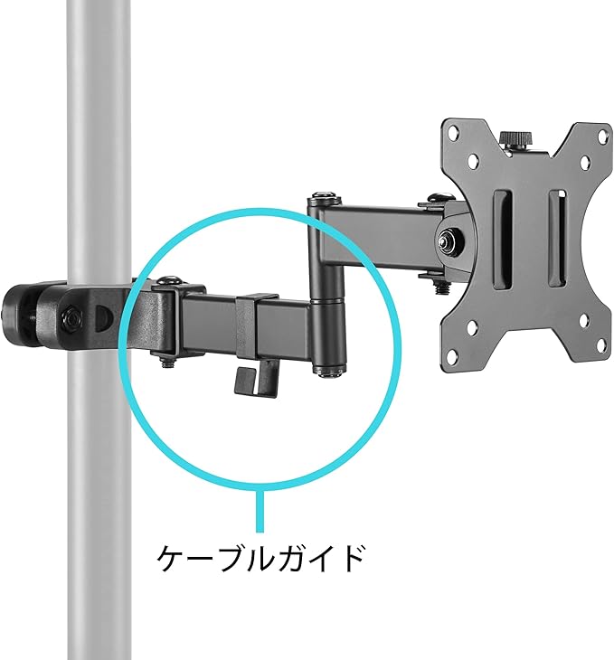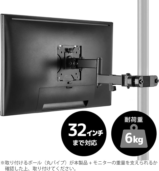 【モニターをメタルラックやポールに設置】デスクではなくメタルラック等のポール(丸パイプ)に固定するモニターアームです。 最大で6kg、32インチまでのモニターに対応します。 ※取り付けるポール(丸パイプ)が本製品+モニターの重量を支えられるか確認した上、取り付けてください。