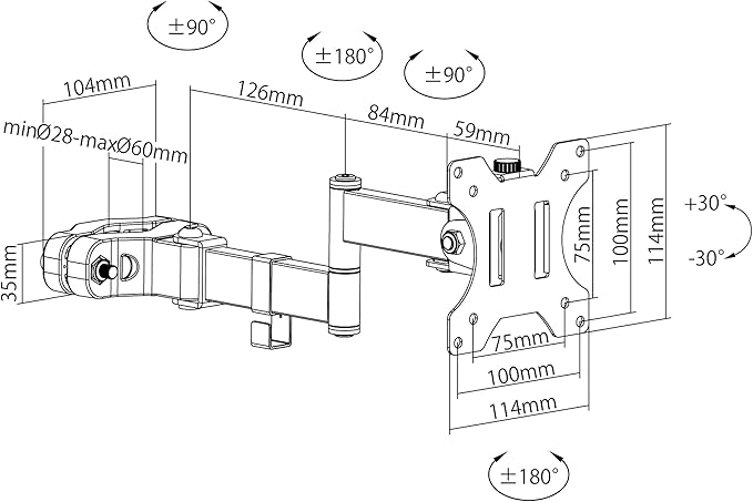 【角度をつけての使用可能】取り付けたモニターは360 (180 ずつ)回転して、縦方向など好きな位置で使用可能です。 左右パン方向に180 (90 ずつ)、上下チルト方向に60 (30 ずつ)角度を付けられます。 また、直径30~55mmの丸パイプに固定することができるため、多くのメタルラックに対応します。