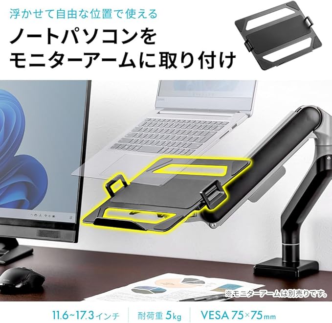 イーサプライ モニターアーム ノートPC モバイルモニター用 マウントトレー スチール製 11.6~17.3インチ VESA75 75対応 ラップトップ ブラック EEX-VESANPC03BK