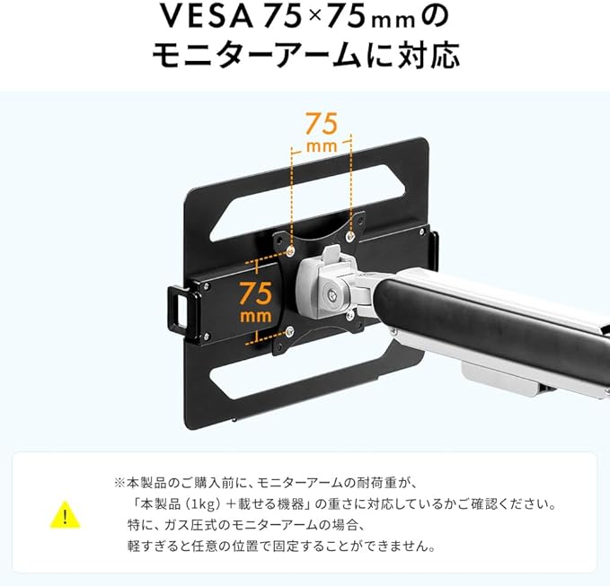 【ご注意】※本製品のご購入前に、モニターアームの耐荷重が、「本製品(1kg)+載せる機器」の重さに対応しているかご確認ください。特に、ガス圧式のモニターアームの場合、軽すぎると任意の位置で固定することができません。